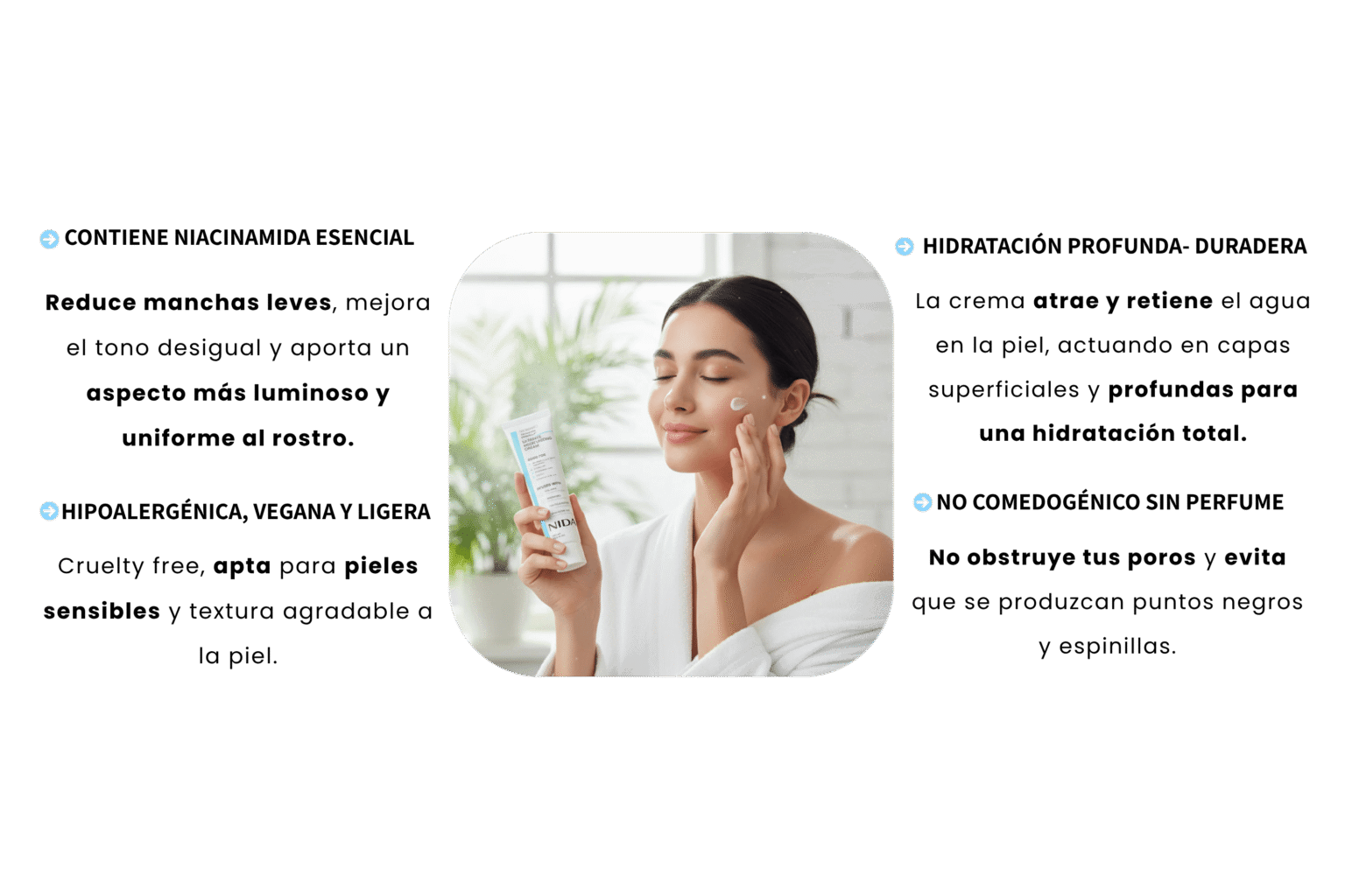 Su textura ligera permite una absorción inmediata, sin dejar sensación grasa ni pesada. Esto la convierte en una excelente base para el maquillaje o como hidratante diario.