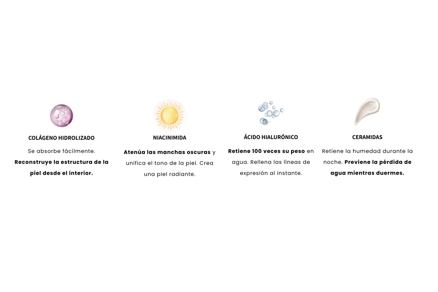 Colágeno: Reconstruye la estructura de la piel desde el interior.
