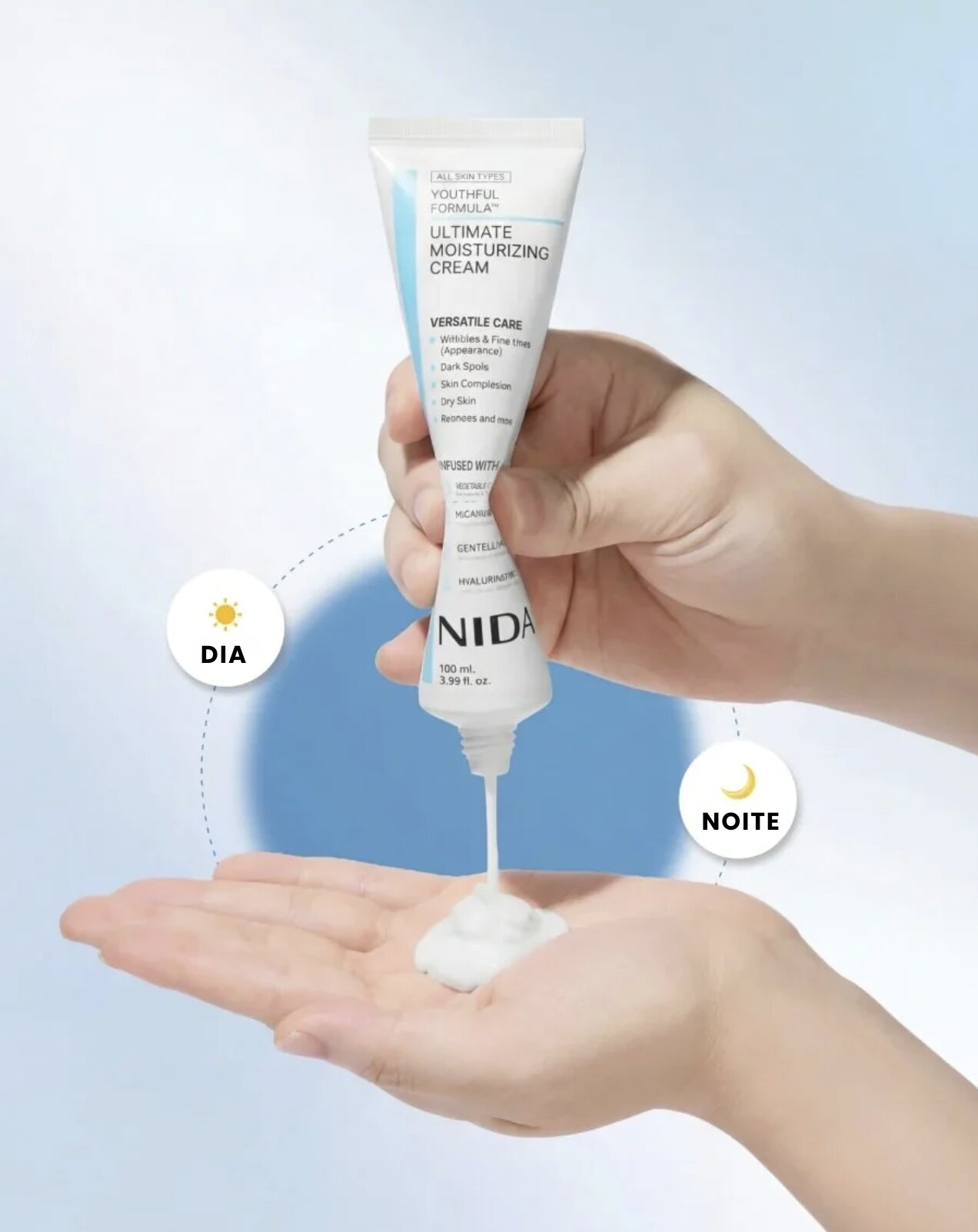 É ideal tanto de manhã como à noite. Durante o dia, hidrata e prepara a pele antes da maquilhagem e, à noite, ajuda a reparar e a nutrir enquanto dorme.